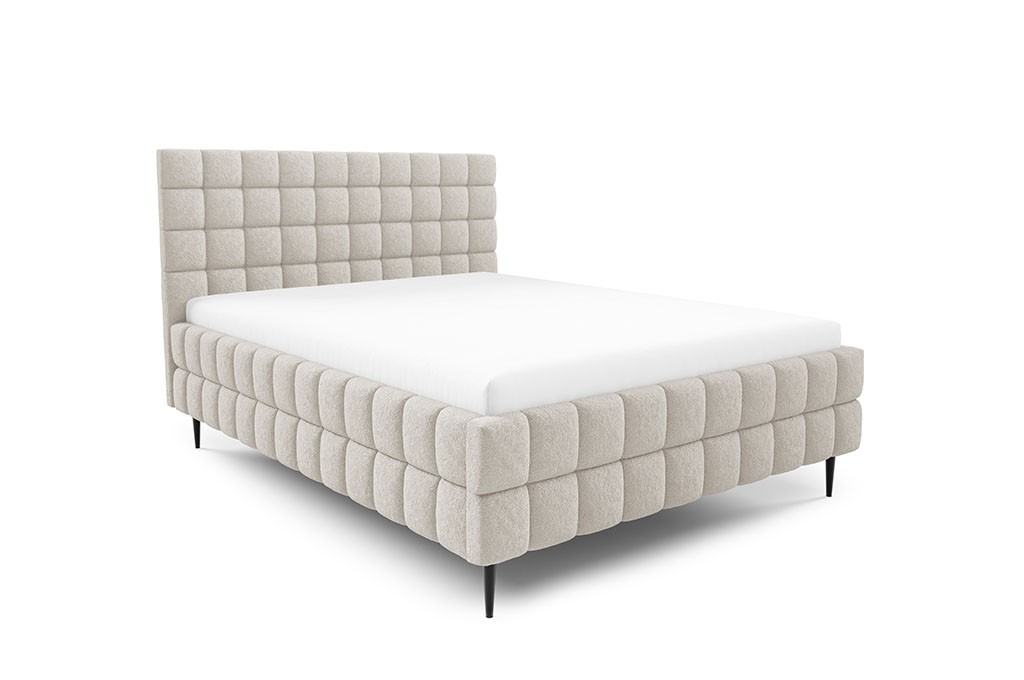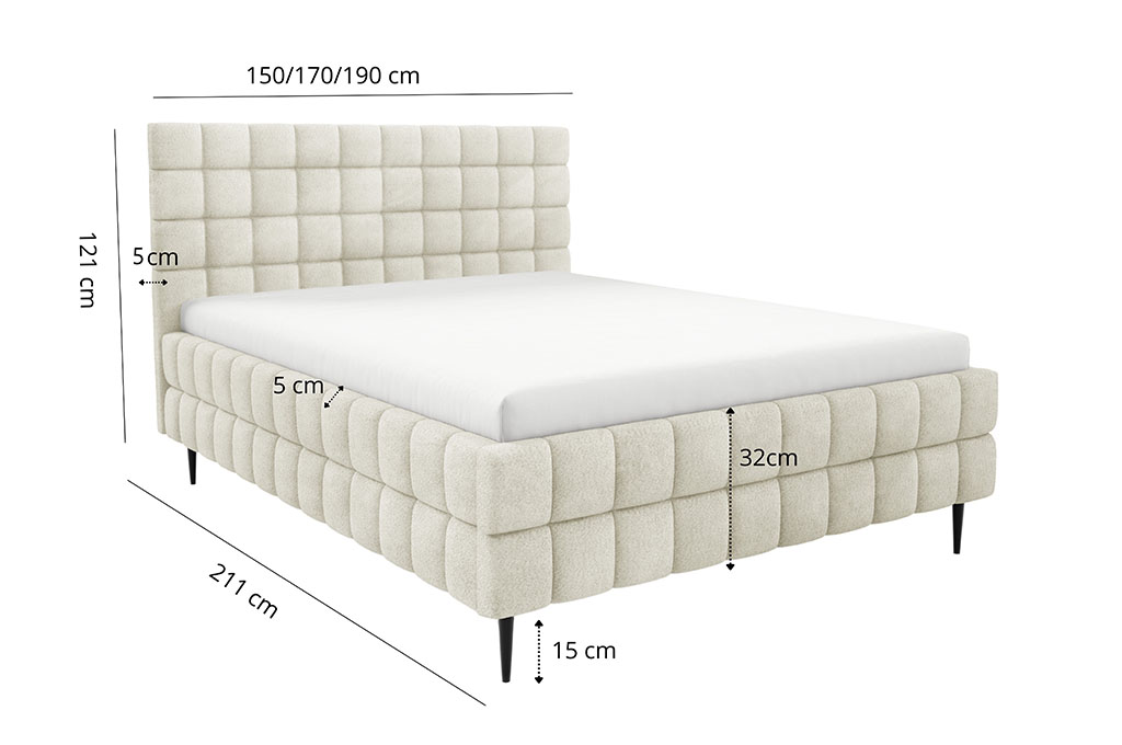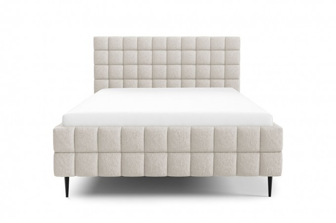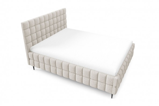 Tapicerowana konstrukcja łóżka została ozdobiona efektownymi przeszyciami w kształcie kwadratu, które nadają bryle wyrazistego charakteru i podkreślają jej nowoczesny styl. Subtelne detale sprawiają, że AURELIA przyciąga wzrok i staje się centralnym punktem sypialni, wprowadzając do niej atmosferę elegancji oraz przytulności.
