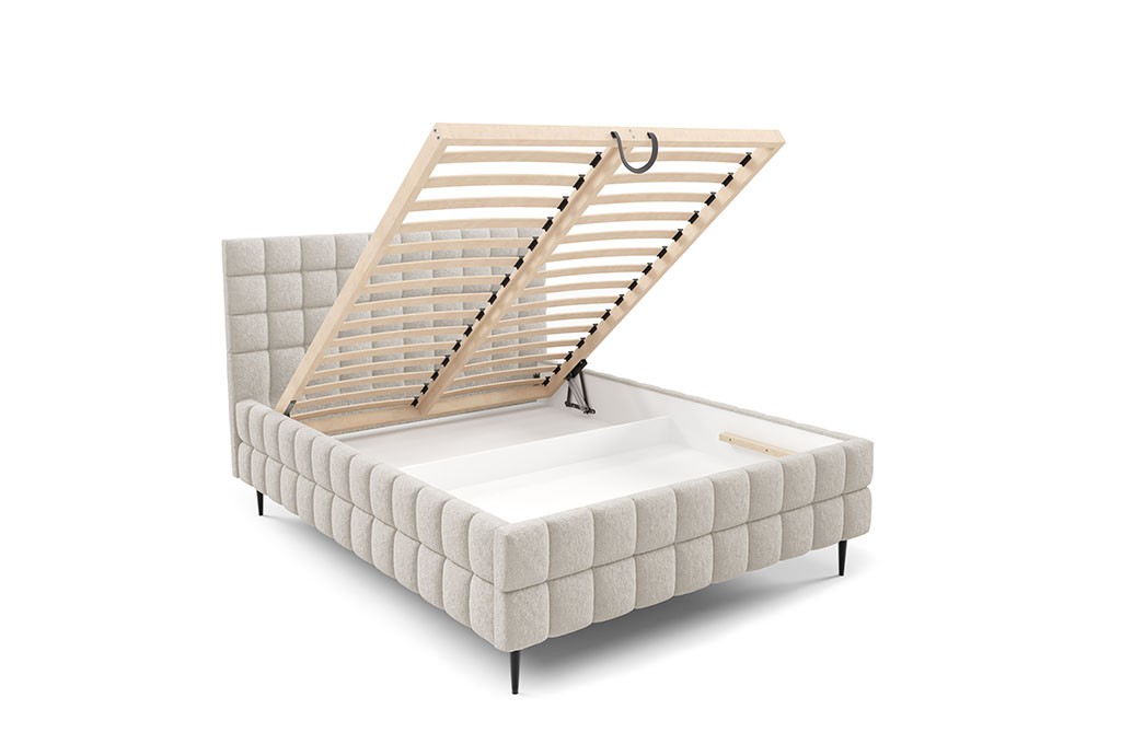 AURELIA to także funkcjonalność, która ułatwia codzienne życie. Łóżko zostało wyposażone w praktyczny pojemnik na pościel, idealny do przechowywania kołder, poduszek czy innych tekstyliów. Dzięki zastosowaniu automatu na sprężynach podnoszenie stelaża jest lekkie i wygodne, co zapewnia szybki i bezproblemowy dostęp do przestrzeni przechowywania.