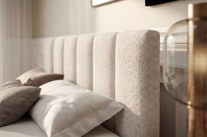 Tapicerowana konstrukcja została wzbogacona o ozdobne przeszycia, które nadają całości eleganckiego charakteru i podkreślają nowoczesny design mebla. Dzięki nim łóżko przyciąga uwagę i staje się efektownym elementem wystroju wnętrza, wprowadzając do sypialni przytulną, a zarazem stylową atmosferę.