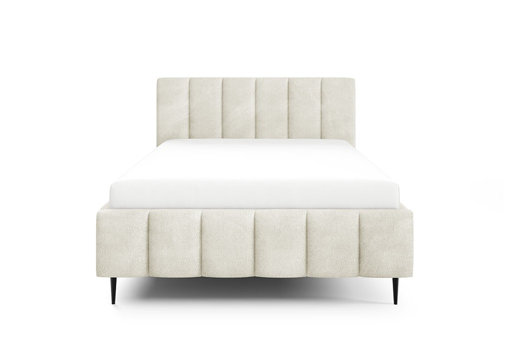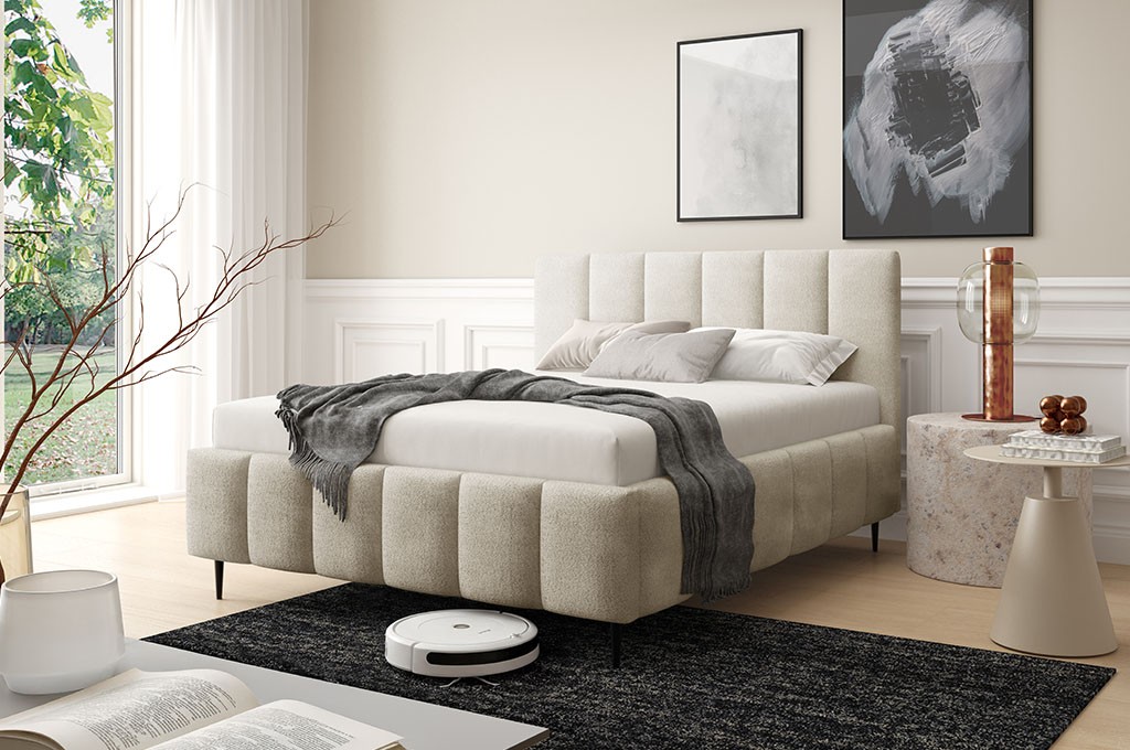 Łóżko tapicerowane na metalowych nóżkach z pojemnikiem na pościel i stelażem drewnianym CORAL LUNERO 180x200