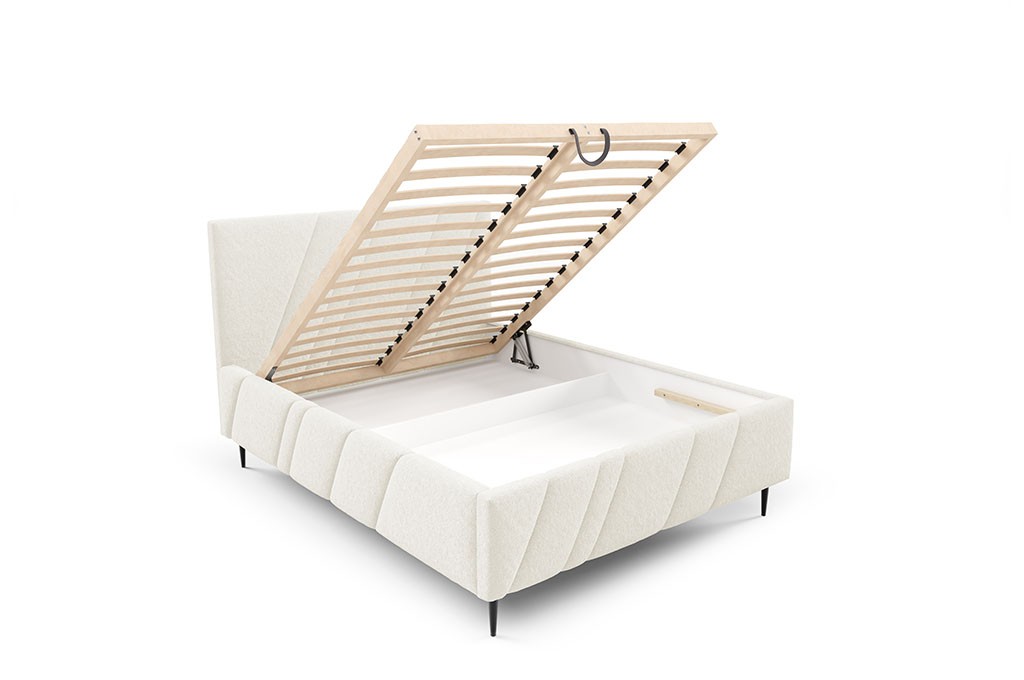 Praktyczne rozwiązania w NERO to również funkcjonalny pojemnik na pościel. Dzięki zastosowaniu automatu na sprężynach podnoszenie stelaża jest lekkie i wygodne, co umożliwia szybki dostęp do wnętrza pojemnika i pozwala wygodnie przechowywać kołdry, poduszki oraz inne tekstylia, pomagając utrzymać porządek w sypialni.
