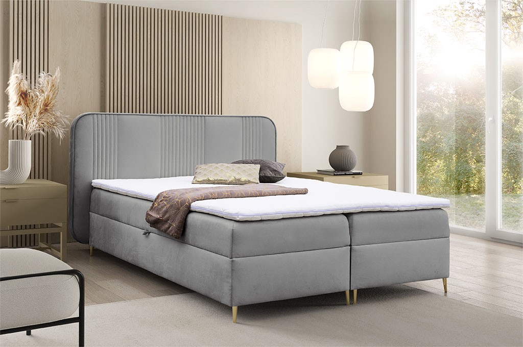 Centralnym elementem łóżka jest efektowne wezgłowie, częściowo tapicerowane tkaniną i ozdobione starannymi przeszyciami, które podkreślają elegancję oraz nowoczesny charakter mebla. Materace częściowo obite tkaniną nadają całości spójny, estetyczny wygląd, a złote metalowe nóżki wprowadzają subtelny, luksusowy akcent, nadając łóżku lekkości i wyjątkowego charakteru.