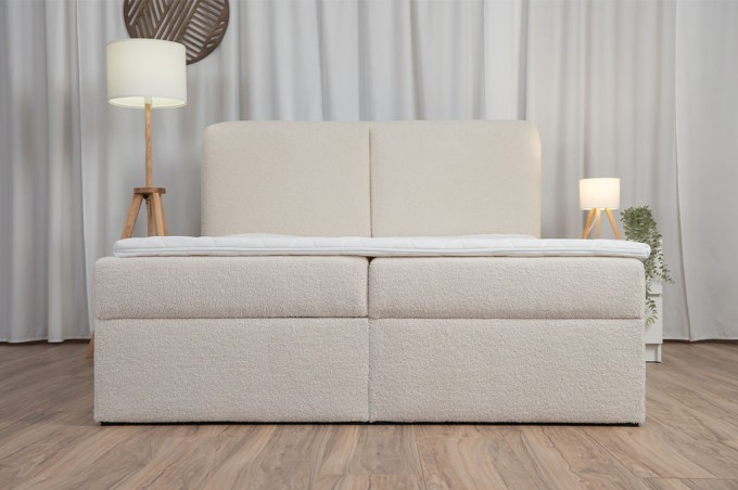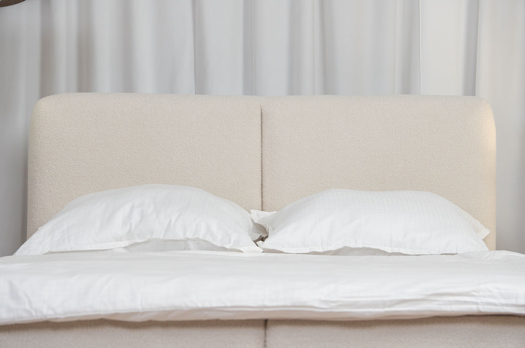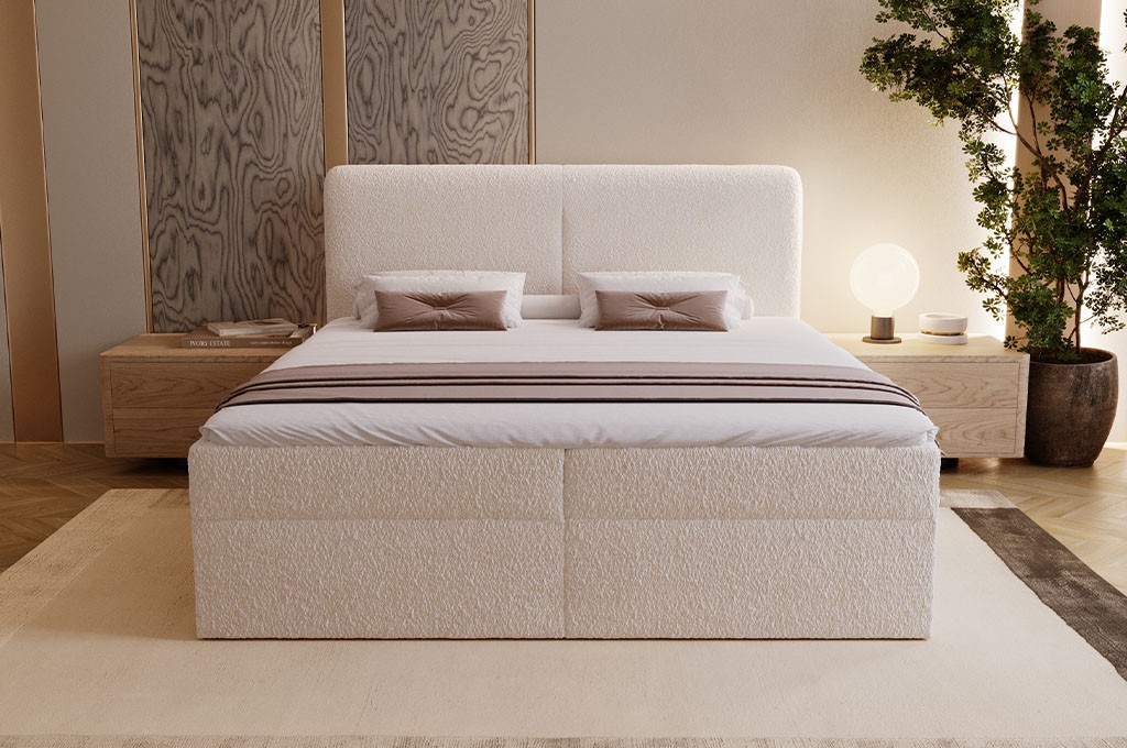 Łóżko zostało obite elegancką tkaniną Lambi, która wyróżnia się miękką, przyjemną w dotyku strukturą typu boucle (tzw. „baranek”). Materiał ten nie tylko prezentuje się niezwykle stylowo, ale również jest odporny na codzienne użytkowanie, łatwy w pielęgnacji i trwały – idealny do nowoczesnych oraz przytulnych wnętrz.