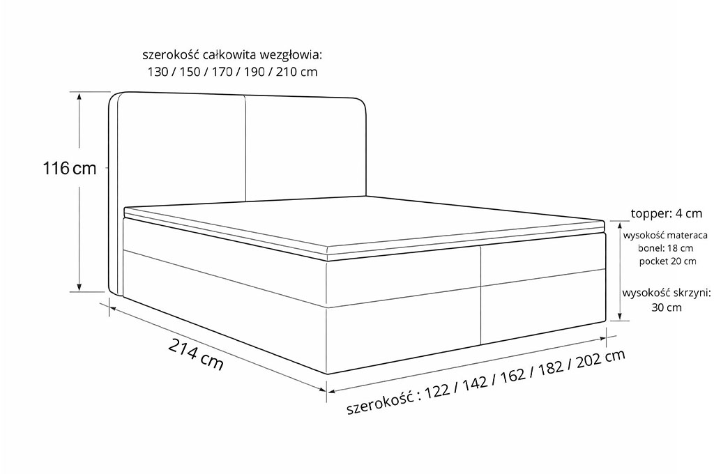 • Szerokość całkowita wezgłowia: 130/150/170/190/210 cm - zależna od wybranego rozmiaru powierzchni spania