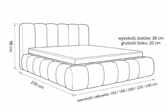 Już na pierwszy rzut oka przyciąga uwagę swoją wyjątkową, zaokrągloną formą. Miękkie, subtelnie zaoblone boki oraz pionowo pikowane wezgłowie tworzą spójną, harmonijną bryłę, która nadaje wnętrzu przytulności i elegancji. To łóżko, które nie tylko wygląda – ono buduje atmosferę relaksu i spokoju.