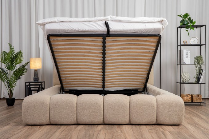 NOEMI to jednak nie tylko design – to również przemyślana funkcjonalność. Pod elegancką formą kryje się praktyczny pojemnik na pościel, który bez problemu pomieści kołdry, poduszki czy sezonowe tekstylia. Dzięki zastosowaniu siłowników gazowych, jego otwieranie jest lekkie i wygodne – nawet przy codziennym użytkowaniu.