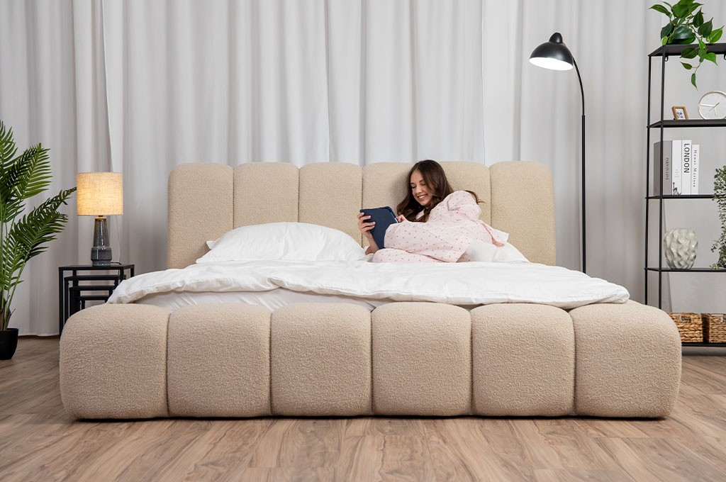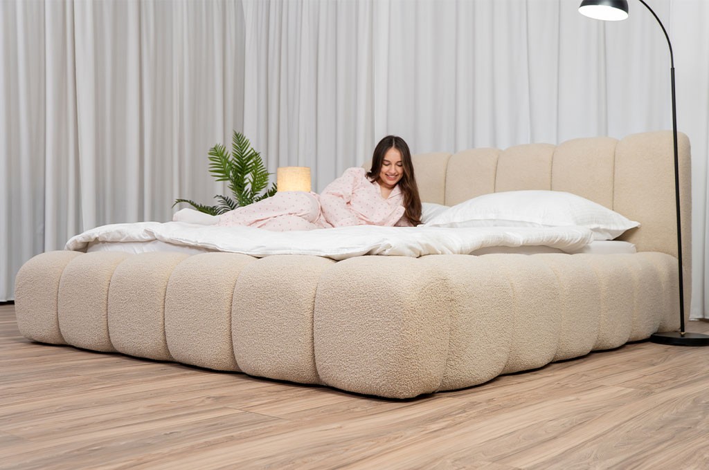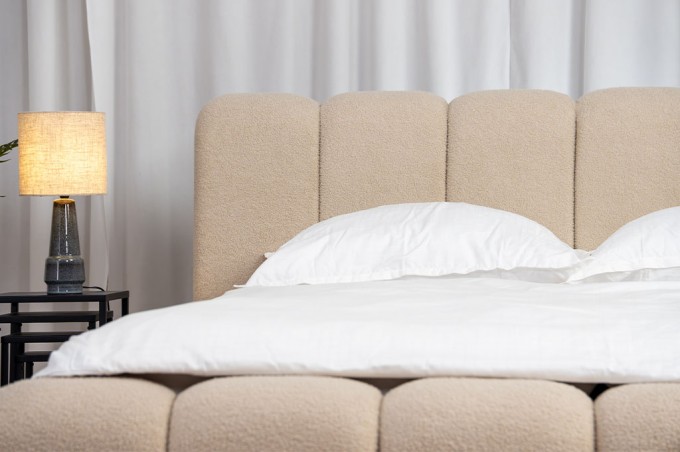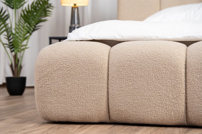 Całość została obita tkaniną LAMBI o strukturze boucle, znanej również jako „baranek”. To materiał, który aż chce się dotknąć – miękki, przyjemny i ciepły w odbiorze. Jednocześnie jest trwały i odporny na codzienne użytkowanie, dzięki czemu łóżko przez długi czas zachowuje swój piękny wygląd. Idealnie wpisuje się zarówno w nowoczesne, jak i bardziej przytulne aranżacje wnętrz.