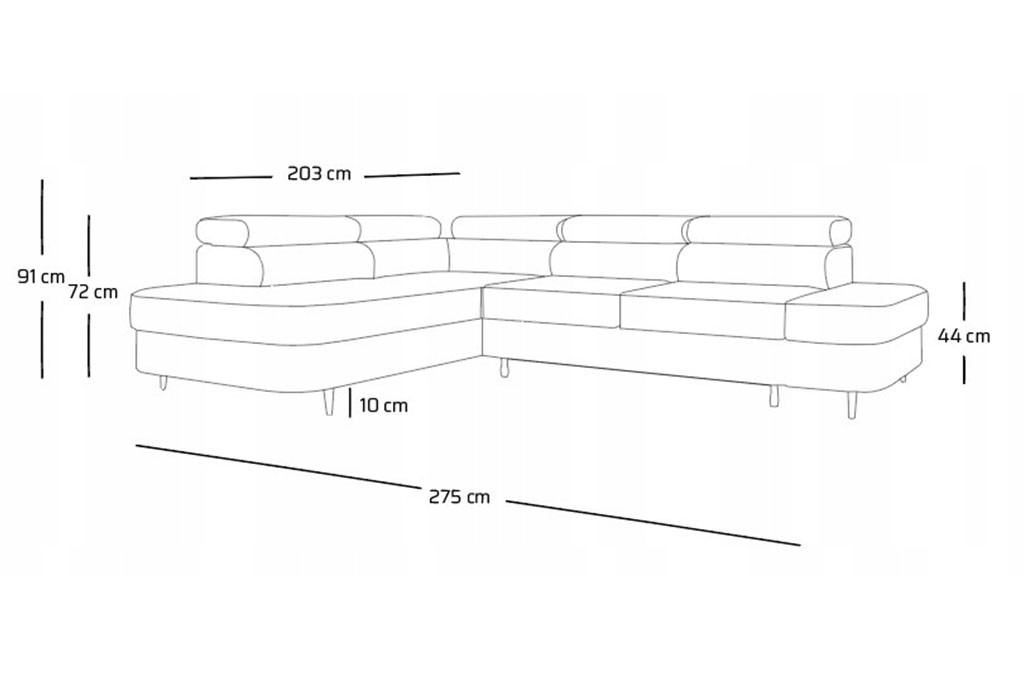 Dzięki przemyślanym proporcjom – szerokość 275 cm i głębokość 203 cm – narożnik zapewnia dużą powierzchnię do relaksu, jednocześnie zachowując lekkość wizualną. Całość dopełniają wysokie, czarne nóżki (10 cm), które nadają bryle nowoczesnego charakteru oraz ułatwiają utrzymanie czystości pod meblem.