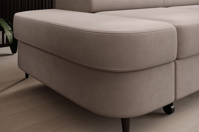 Narożnik wyróżnia się również dopracowanymi, nowoczesnymi detalami, które nadają mu eleganckiego i stylowego charakteru. Komfort użytkowania podnoszą wygodne, lekko twardsze siedziska, które zapewniają stabilne podparcie i eliminują efekt zapadania się, dzięki czemu mebel doskonale sprawdza się zarówno podczas codziennego wypoczynku, jak i dłuższego użytkowania.