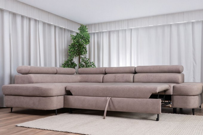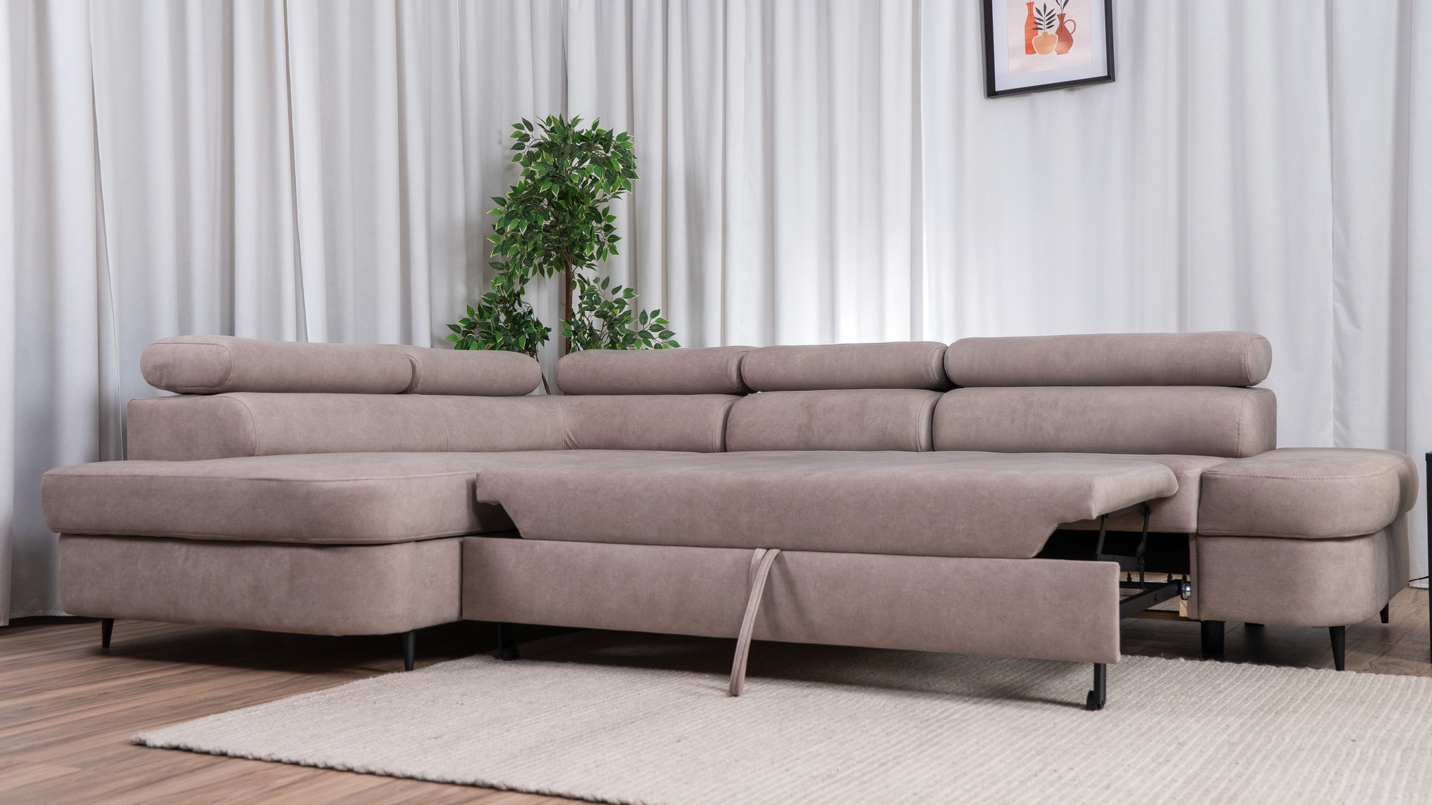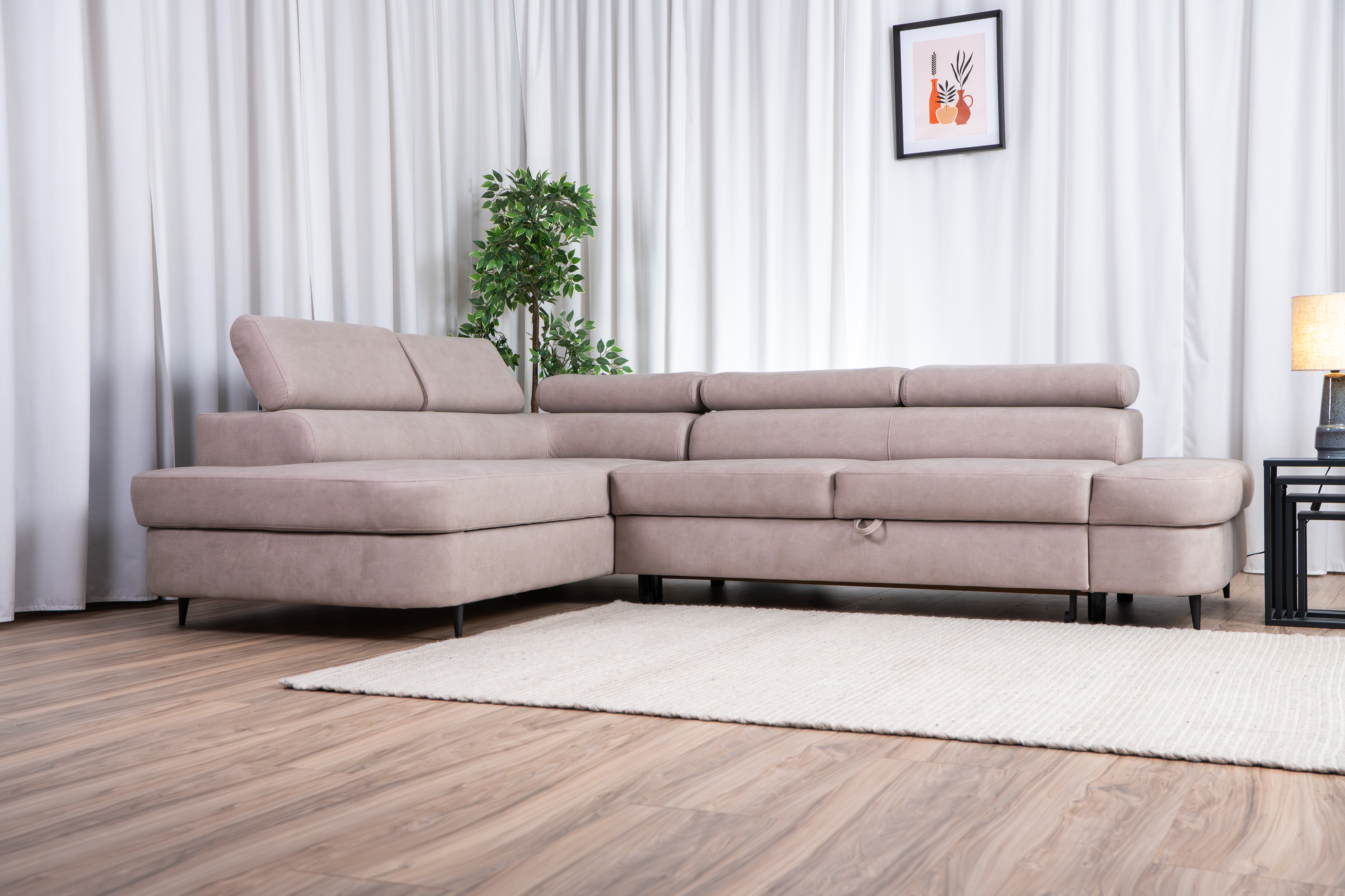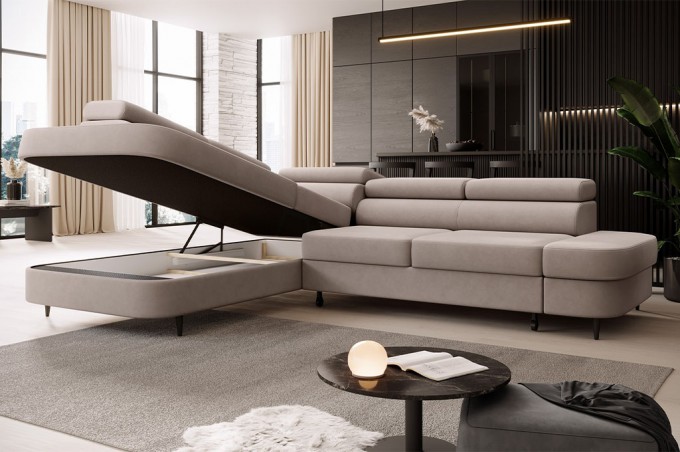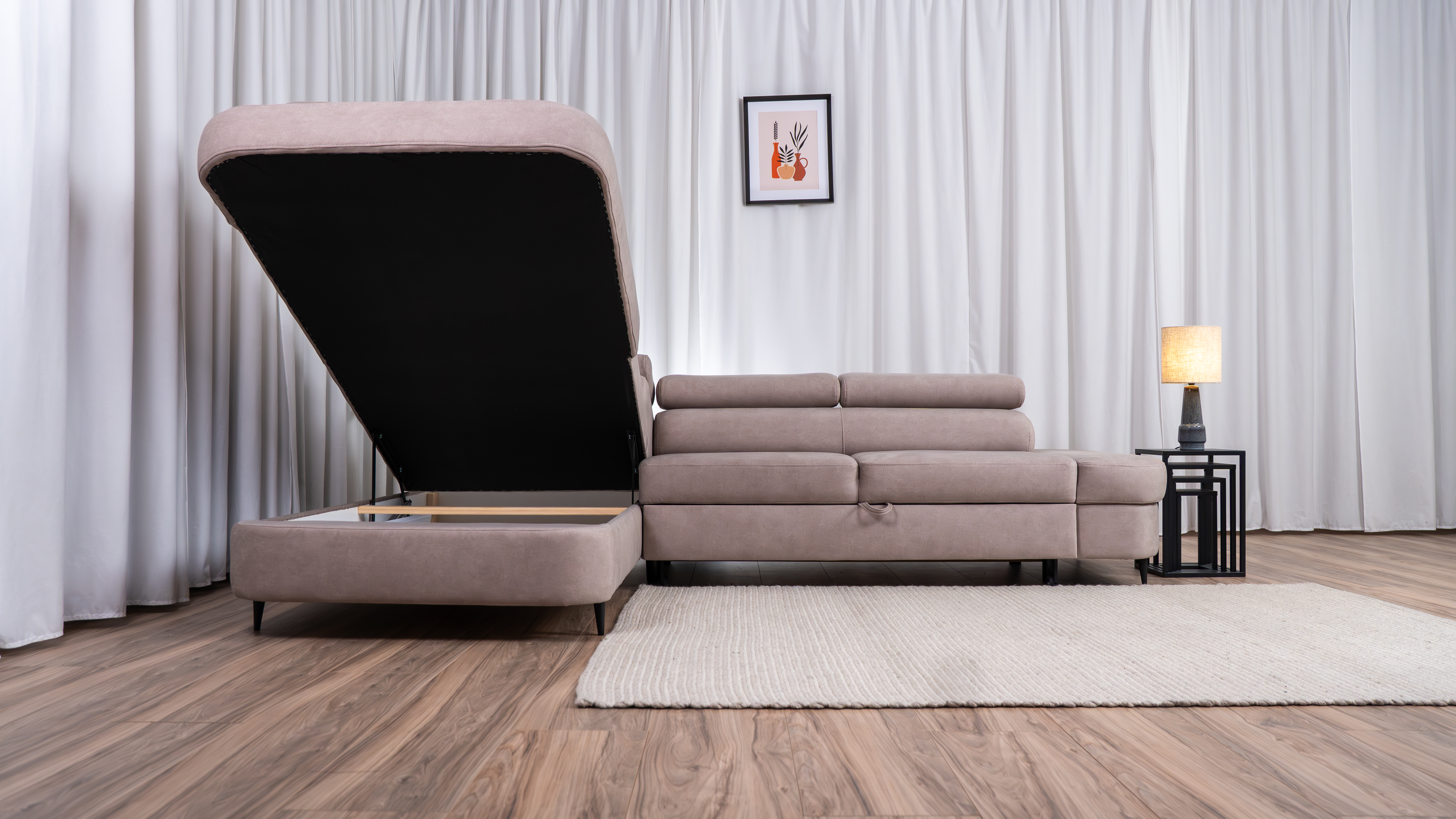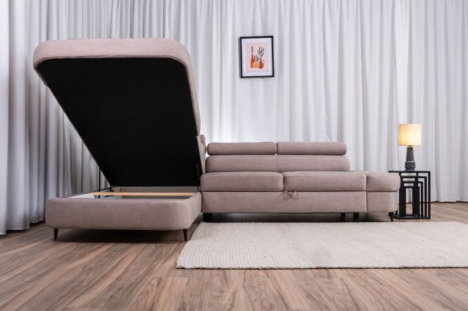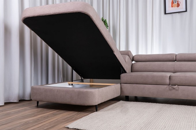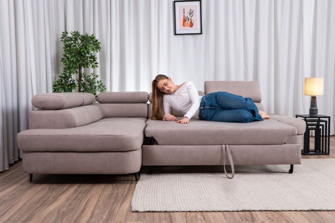 Narożnik został wyposażony w funkcję spania, która w kilka chwil pozwala zamienić go w wygodne łóżko. Dzięki intuicyjnemu systemowi rozkładania przygotowanie miejsca do snu jest szybkie i bezproblemowe. To idealne rozwiązanie zarówno do codziennego użytkowania, jak i podczas wizyt gości.