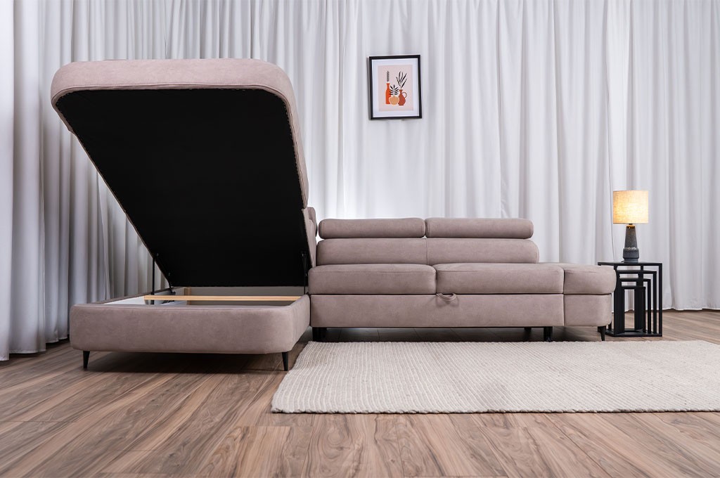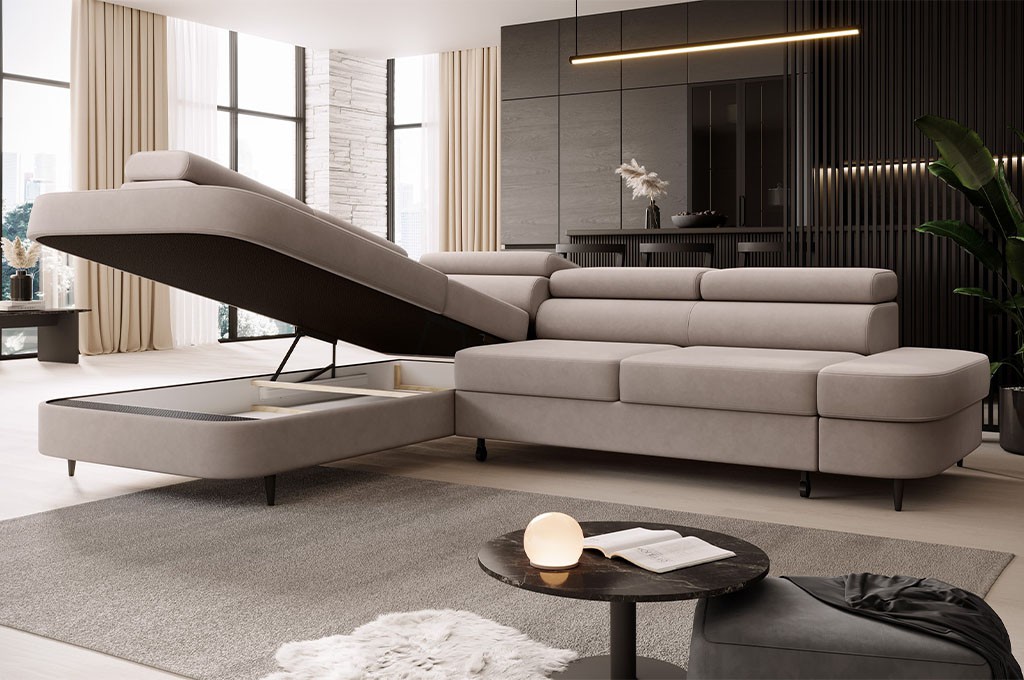 Model CARLOS posiada również pojemnik na pościel, który umożliwia wygodne przechowywanie koców, poduszek czy dodatkowych kompletów pościeli. To funkcjonalne rozwiązanie pozwala zaoszczędzić miejsce w szafie i utrzymać porządek w salonie.