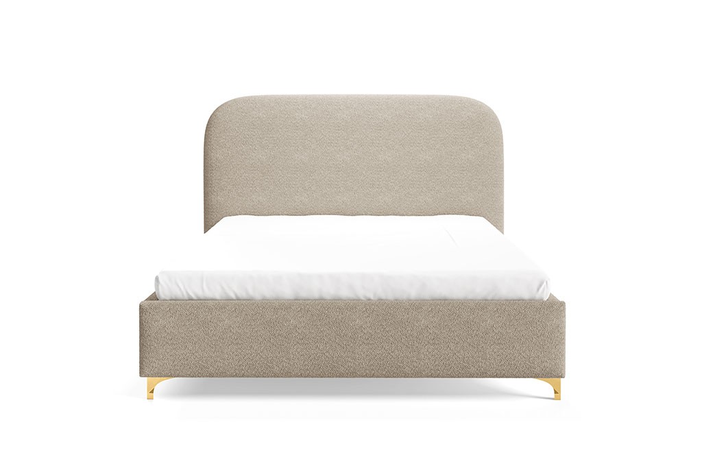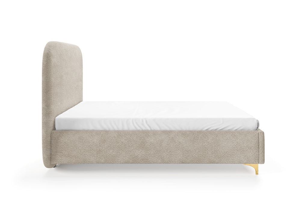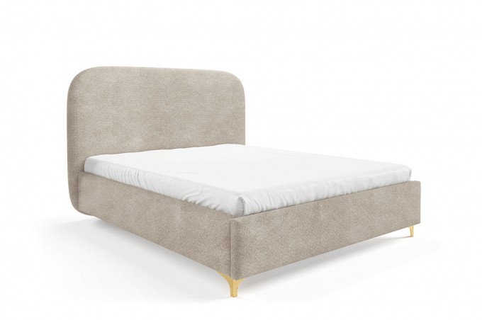 Model osadzony jest na smukłych, metalowych nóżkach w eleganckim złotym kolorze, które dodają całości wyrafinowanego charakteru. Dzięki nim łóżko prezentuje się lekko i stylowo, jednocześnie zachowując stabilność oraz trwałość konstrukcji.