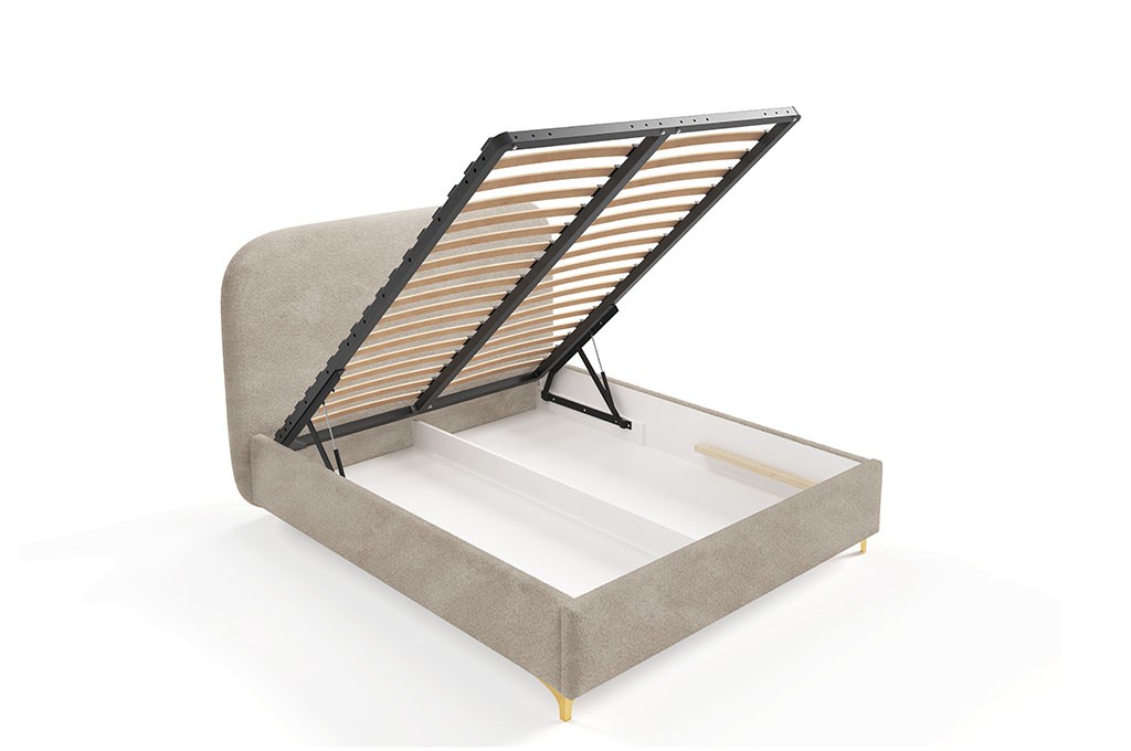 LUNAR to także praktyczne rozwiązania, które ułatwiają codzienne funkcjonowanie. Łóżko zostało wyposażone w pojemnik na pościel, idealny do przechowywania kołder, poduszek oraz innych tekstyliów. Dzięki zastosowaniu siłowników gazowych o mocy 1000N podnoszenie stelaża jest lekkie, płynne i wygodne, co zapewnia szybki dostęp do przestrzeni przechowywania.