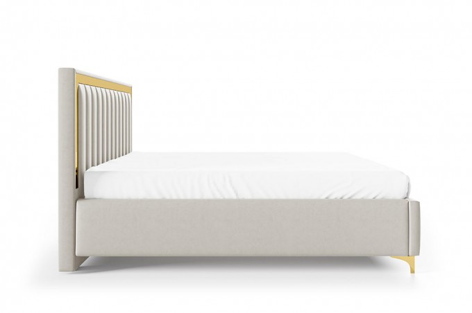 Tapicerowana konstrukcja przyciąga uwagę efektownym wezgłowiem z ozdobnym przeszyciem. Całość została subtelnie podkreślona dekoracyjną listwą w kolorze złotym lub srebrnym, która nadaje bryle wyrafinowanego charakteru i podkreśla jej elegancki styl. Wezgłowie nie tylko zdobi, ale również zapewnia wygodne oparcie podczas codziennego wypoczynku, czytania czy relaksu.