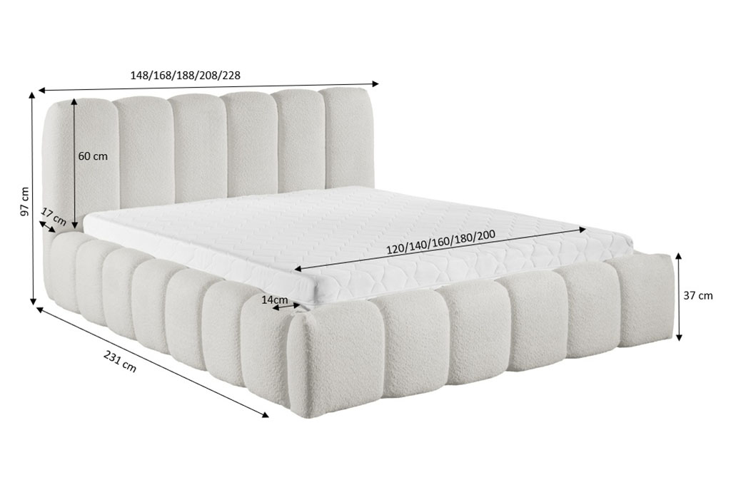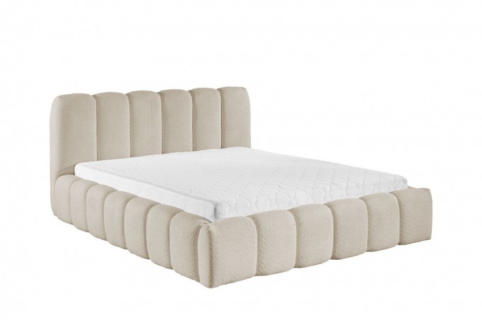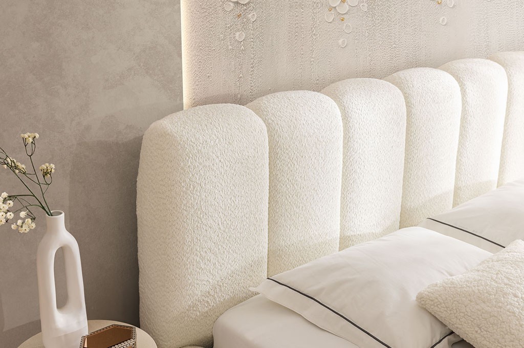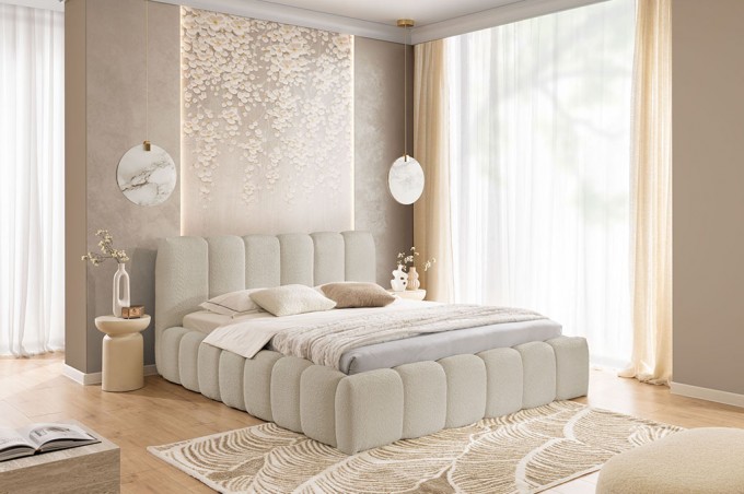 Tapicerowana konstrukcja została wykonana z modnej tkaniny boucle, która zachwyca swoją strukturą i przyjemną w dotyku powierzchnią. Charakterystyczne ozdobne przeszycia nadają bryle wyrazistości, podkreślając jej stylowy i nowoczesny charakter. Wezgłowie stanowi nie tylko element dekoracyjny, ale również wygodne oparcie podczas relaksu, czytania czy wieczornego odpoczynku.