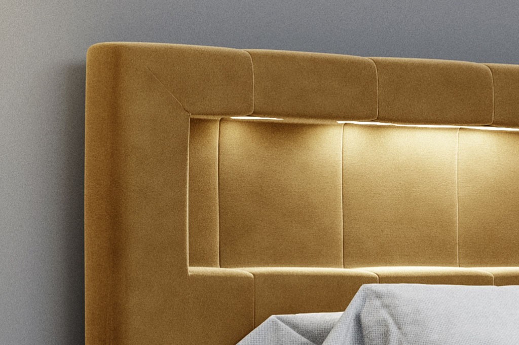 Dodatkowym udogodnieniem jest oświetlenie LED o zimnej barwie, sterowane pilotem, które wprowadza nowoczesny klimat do sypialni i zwiększa funkcjonalność łóżka po zmroku.