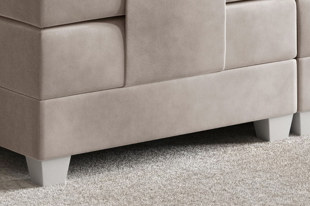 Ozdobne przeszycia dodatkowo akcentują nowoczesny styl łóżka, a materace częściowo obite tkaniną tworzą spójną i estetyczną bryłę. Całość osadzona jest na stabilnych, plastikowych nóżkach w kolorze srebrnym, które zapewniają solidne podparcie oraz subtelnie podkreślają nowoczesny wygląd mebla.