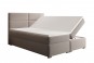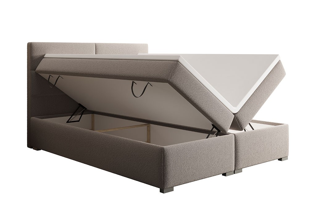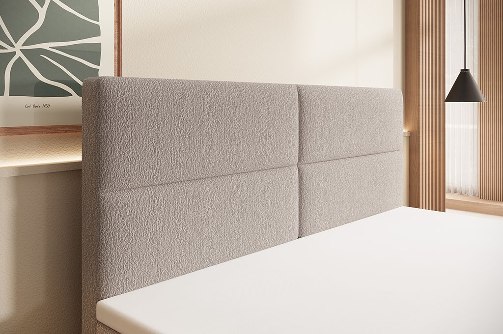 Tył łóżka wykończono materiałem typu fibertex – trwałym i przewiewnym, który zapewnia odpowiednią cyrkulację powietrza oraz zwiększa żywotność konstrukcji. Całość osadzona jest na eleganckich nogach w kolorze srebrnym, które nadają bryle lekkości i nowoczesnego charakteru.