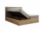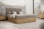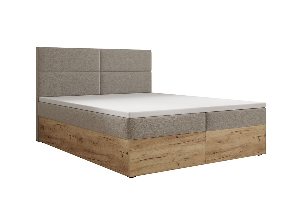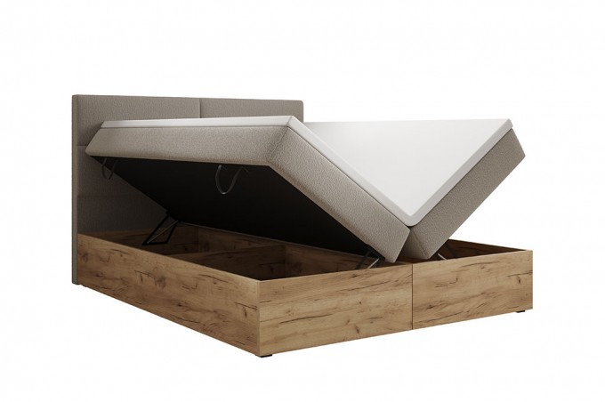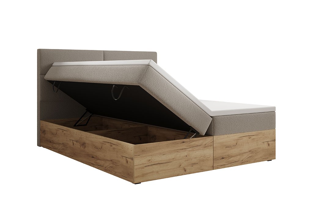 Skrzynia została wykonana z płyty w eleganckim kolorze Dąb Craft Złoty, który nadaje wnętrzu ciepłego, naturalnego charakteru. Tył łóżka wykończono materiałem typu fibertex – trwałym i przewiewnym, zapewniającym odpowiednią cyrkulację powietrza oraz zwiększoną higienę użytkowania.
