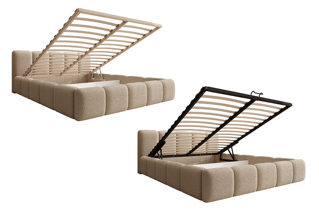 - Stelaż metalowy z siłownikami gazowymi – nowoczesne rozwiązanie, które ułatwia podnoszenie stelaża i zapewnia wygodny dostęp do pojemnika na pościel. Charakteryzuje się wysoką trwałością oraz stabilnością konstrukcji.