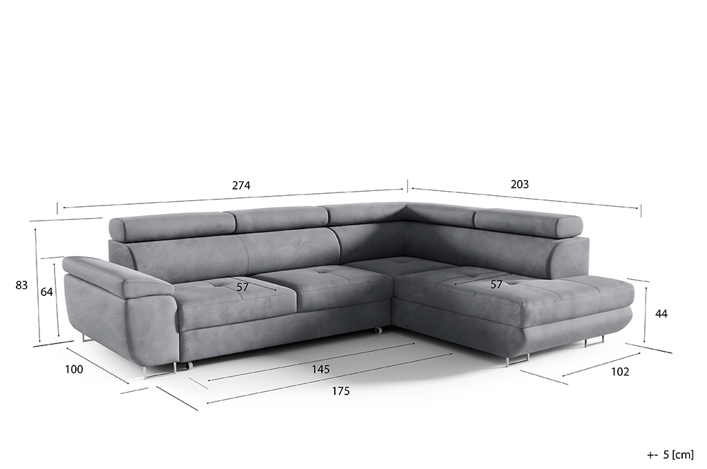 Narożnik LISA to połączenie wyjątkowej wygody i elegancji, które sprawia, że staje się on sercem każdego salonu. Jego imponująca szerokość 274 cm i głębokie siedzisko o wymiarze aż 57 cm zapraszają do relaksu – zarówno w rodzinnym gronie, jak i podczas spokojnych chwil w pojedynkę. Dzięki wysokości 83 cm oraz regulowanym zagłówkom możesz dopasować wysokość oparcia do własnych potrzeb, ciesząc się idealnym podparciem głowy i karku.