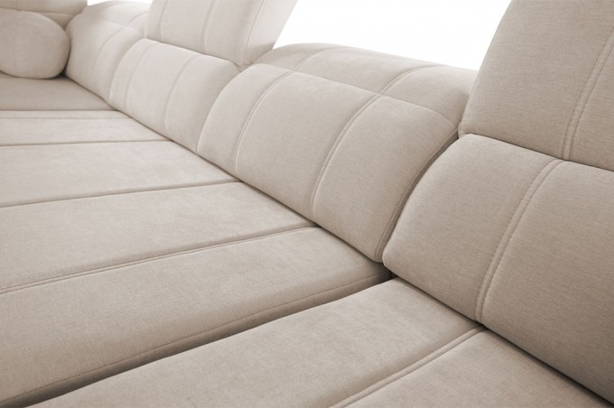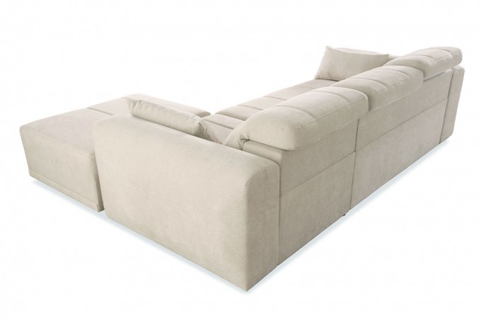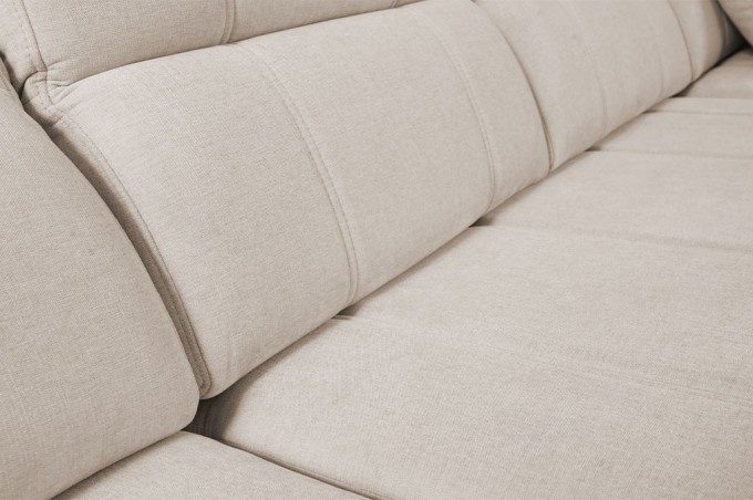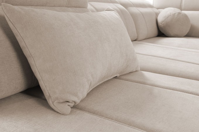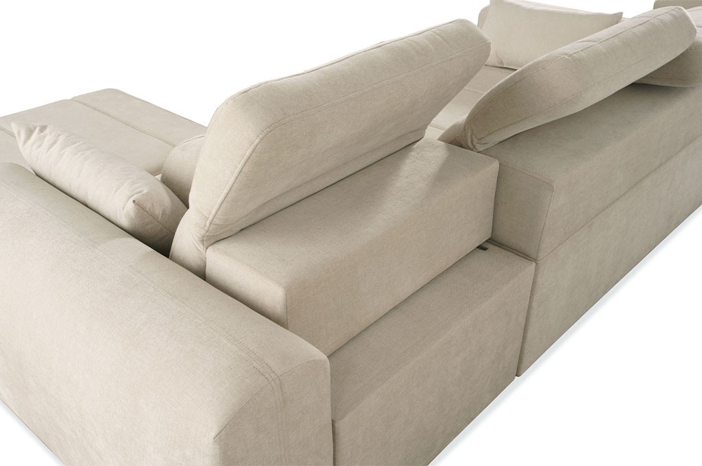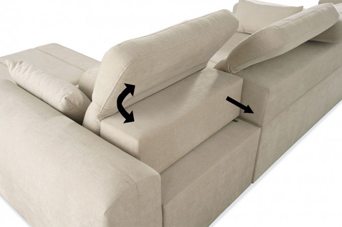 Narożnik został wyposażony w 3 regulowane zagłówki, które zapewniają odpowiednie podparcie dla głowy i karku. Dodatkowo regulowane oparcia pozwalają dostosować głębokość siedziska w zakresie od 59 do 73 cm, co daje możliwość idealnego dopasowania pozycji do własnych preferencji.