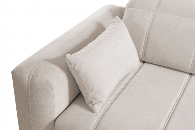 Model został wyposażony w 1 pojemnik na pościel, który ułatwia przechowywanie tekstyliów oraz poduszki dekoracyjne w zestawie, podkreślające styl mebla.