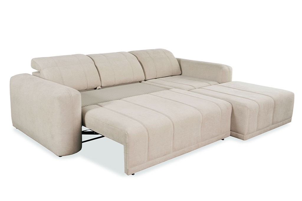 Funkcja spania w narożniku RAFAEL I to wygodne i praktyczne rozwiązanie, które pozwala w szybki sposób zamienić mebel w komfortowe łóżko. Dzięki zastosowaniu automatu typu PUMA rozkładanie jest niezwykle proste, płynne i nie wymaga użycia siły – wystarczy jeden ruch, aby uzyskać równą powierzchnię do spania.