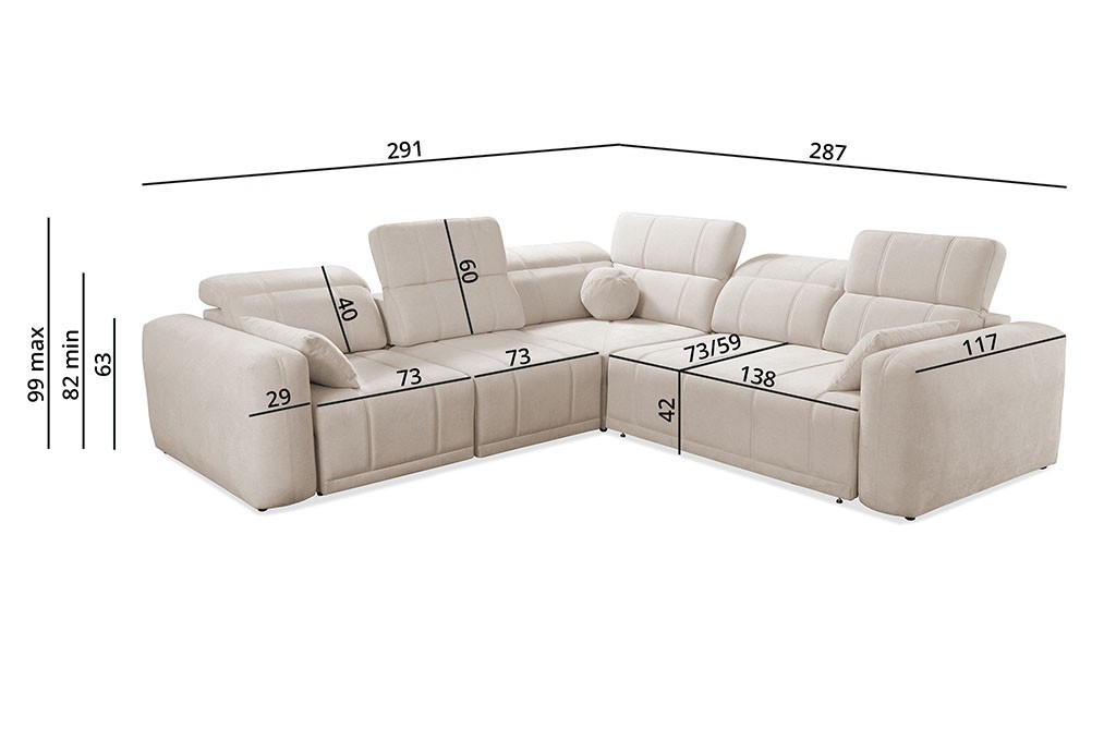 Dodatkowo regulowane oparcia pozwalają dopasować głębokość siedziska w zakresie od 59 do 73 cm, co zapewnia pełną swobodę podczas korzystania z narożnika i pozwala na idealne dopasowanie do wzrostu użytkowników.