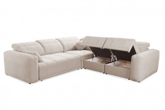 Dodatkowo posiada 2 pojemniki na pościel, które zapewniają praktyczne miejsce do przechowywania koców, poduszek i pościeli. Schowki są łatwo dostępne i pojemne, co ułatwia utrzymanie porządku w salonie.