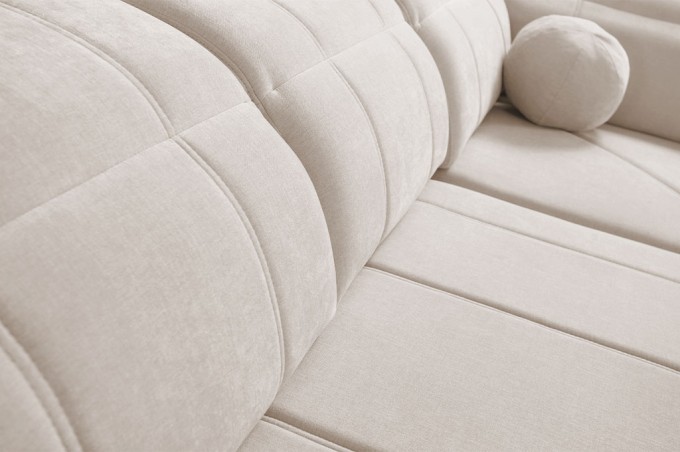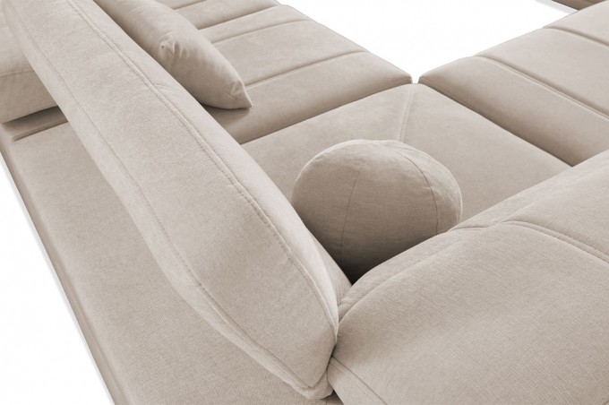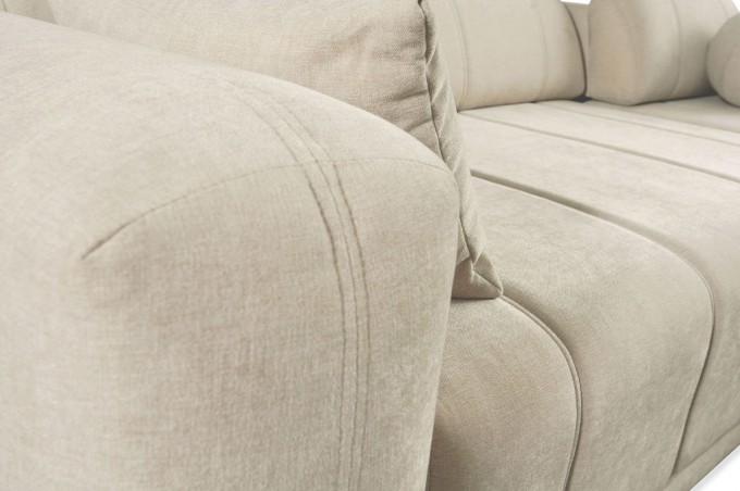 Szerokie, komfortowe podłokietniki oraz luźne poduszki dekoracyjne i oparciowe zwiększają wygodę użytkowania, a subtelne wykończenia i starannie dobrane detale podkreślają nowoczesny charakter mebla.