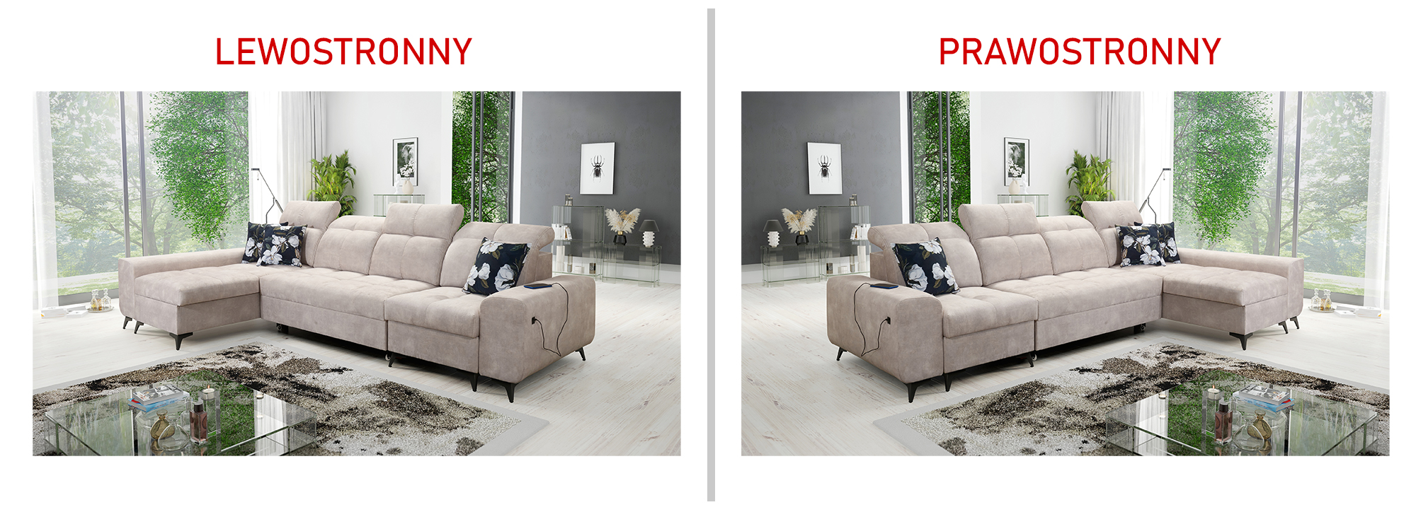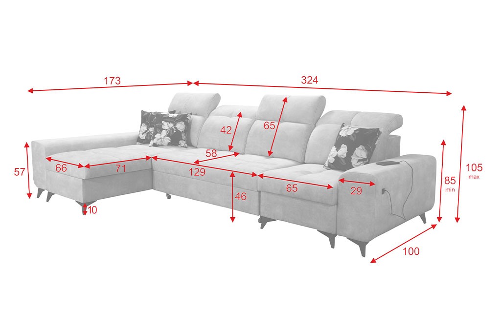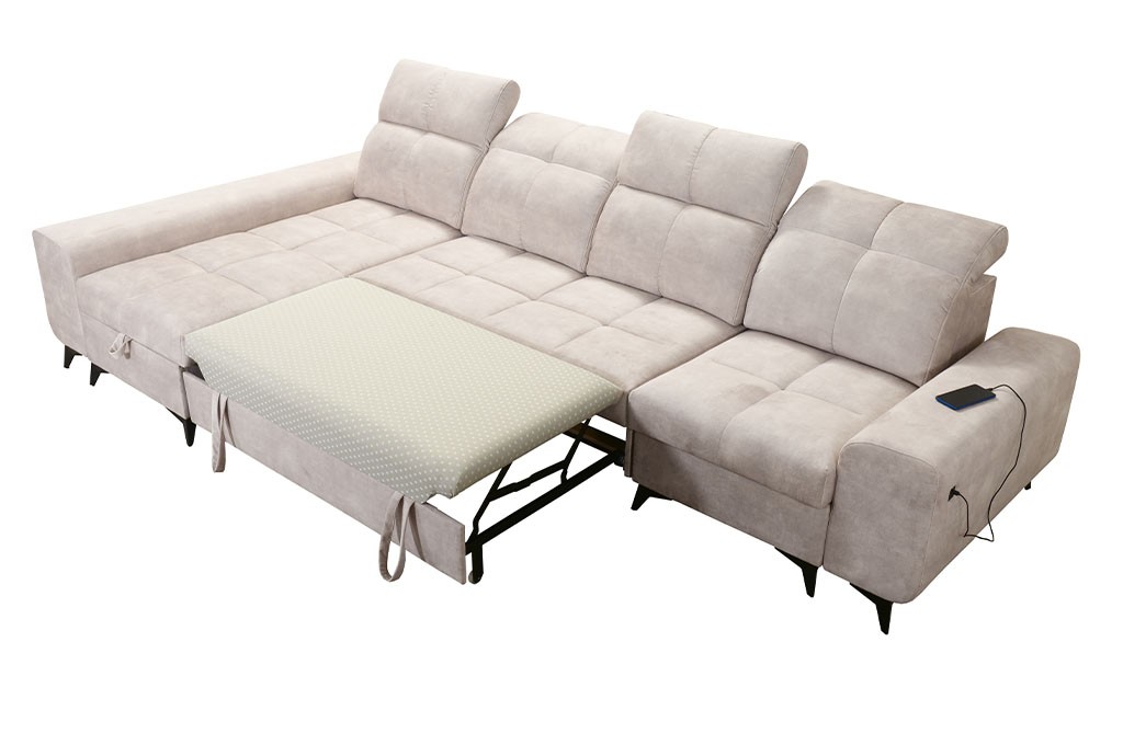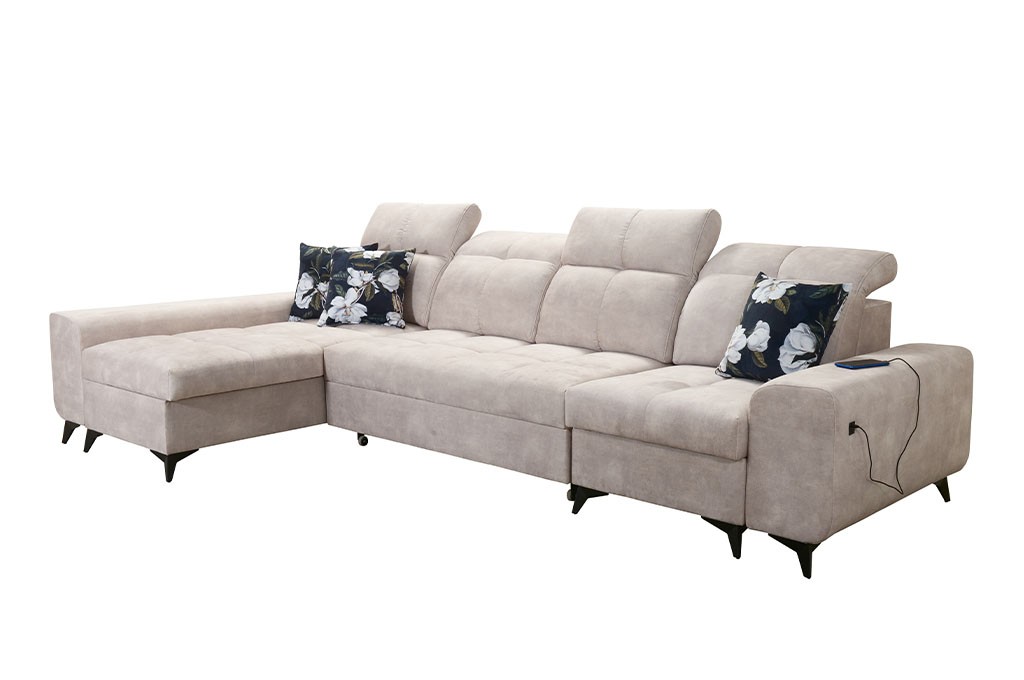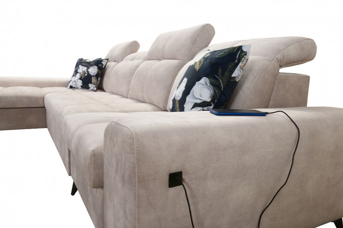 Praktycznym udogodnieniem jest wbudowane gniazdo USB, które pozwala wygodnie naładować telefon, tablet lub inne urządzenie bez konieczności wstawania z narożnika. To nowoczesne rozwiązanie, które zwiększa komfort codziennego użytkowania mebla.