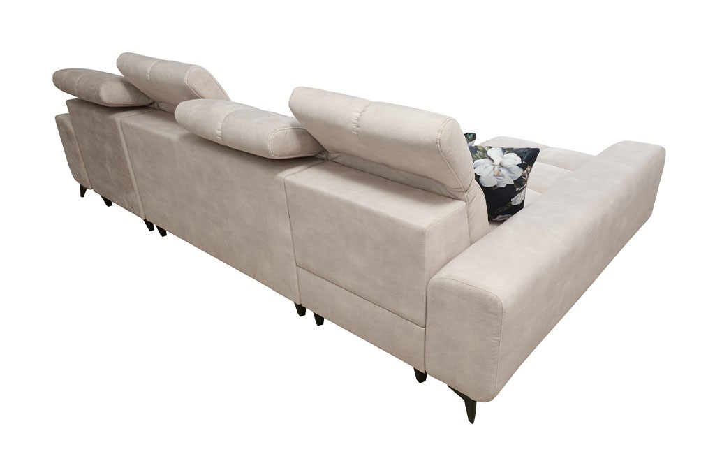 Narożnik GOLDI XII wyposażony jest w 4 regulowane zagłówki, które umożliwiają dopasowanie wysokości oparcia do indywidualnych preferencji użytkownika. Dzięki temu można wygodnie oprzeć głowę i kark podczas oglądania telewizji, czytania książki czy relaksu po długim dniu.